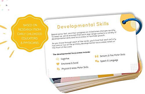 A WHOLE YEAR OF PLAY: The activities are organized and color-coded based on the age of your baby. Starting from weeks 0-12 and moving up every three months, you’ll be able to use these cards throughout the entire first year of your little one’s life. The activities we suggest are appropriate to the stage of development that your baby is going through based on their age in months.