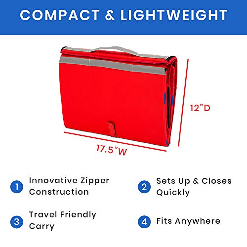 FOLDS FLAT: Innovative zippered design provides quick and compact fold for space-saving storage | Attached handle and hook and loop closure makes it extremely portable | Folded size: 17.5”W x 12”D x 3”H | Assembled size: 17.5”W x 21”D 14”H