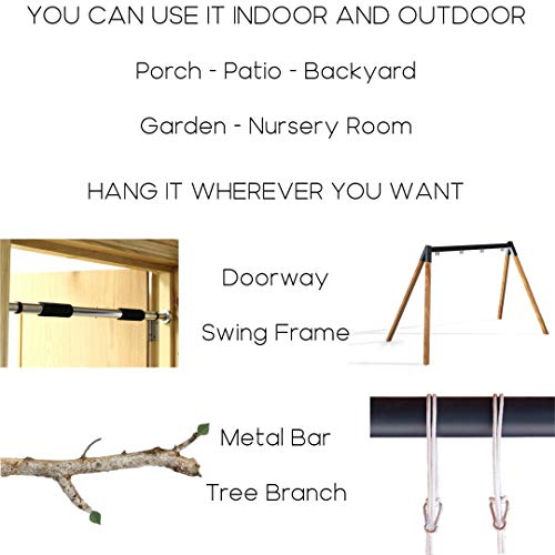 It has more aesthetic appearance than plastic bucket swings. Use it nursery decor in the baby room. The ropes can be completely uncord and does not contain plastic knots like other swings. Hang it where ever you want without straps.( Outside, inside, tree branch, backyard ) Since our ropes are without plastic knots, when your child grows up, you can make a rope ladder to her/him with the sticks and ropes of our swing. Rest easy knowing you’ve made a smart investment that will be long lasting.