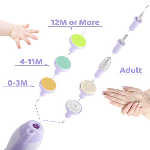 【Buy 1 Nail Trimmer Get 13 Grinding Heads】: Clipping a baby’s nails can be more of a challenge than a chore. The baby nail file creates a wise way for you. 6 gringing heads with 3 texture and colorful sandpapers which are designed for various stages of babies’ growth. 3 cylindrical grinding heads and 2 metal grinding heads for adults, 2 soft grinding heads for polishing. Each sandpaper has a 2mm foam cushion to protect the skin from harm.