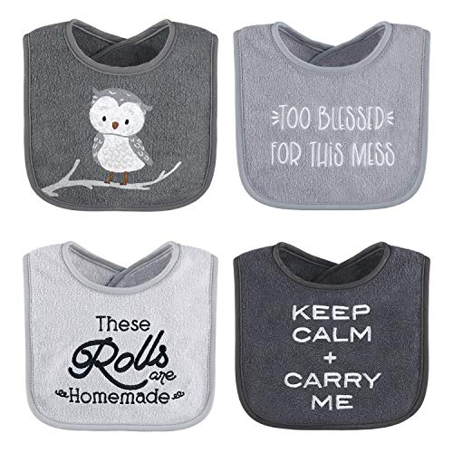8 CUTE UNISEX DESIGNS: Quickly clean up your little one’s adorable face from spills, spit ups, dribbles, and drool with a fun assortment in shades of light and dark grey, warm ivory, tan, and white, featuring fox, owl, pig, cow, and funny sayings. Sweet and stylish with printed and embellished front on super-soft cotton jersey, with a soft terry reverse