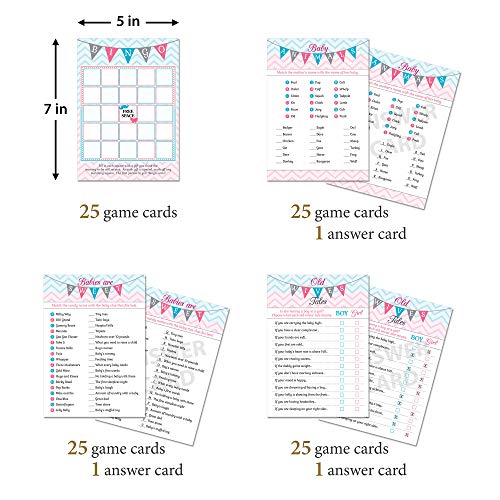 Set includes 4 baby shower games for 25 players and answer cards where needed