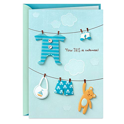 Send your best wishes to new parents with this card featuring a Clothesline holding baby clothes, a bib, and a teddy bear. Card measures 5″ X 7. 2″, and an envelope is included. The Hallmark brand is widely recognized as the very best for greeting cards, gift wrap, and more. For more than 100 years, Hallmark has been helping its customers make everyday moments more beautiful and celebrations more joyful.