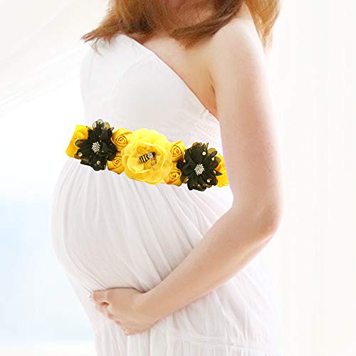 The maternity sash features an array of yellow and black flowers embellished with a gorgeous pearl / rhinestone centers.