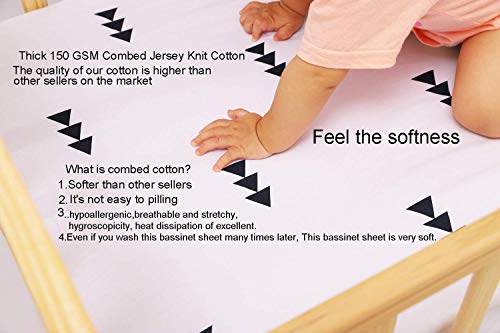 100% HIGH QUALITY JERSEY KNIT COTTON– Thick 150 GSM jersey knit cotton material (Cotton wool on the surface).hypoallergenic,ultra soft,breathable and stretchy, hygroscopicity,heat dissipation of excellent..It’s not easy to pilling.The quality of our cotton is higher than other brand.Even if you wash this bassinet sheet many times later, This bassinet sheet is very soft.This bassinet will protect your baby’s skin. Forget about skin rashes. Forget about discomfort.