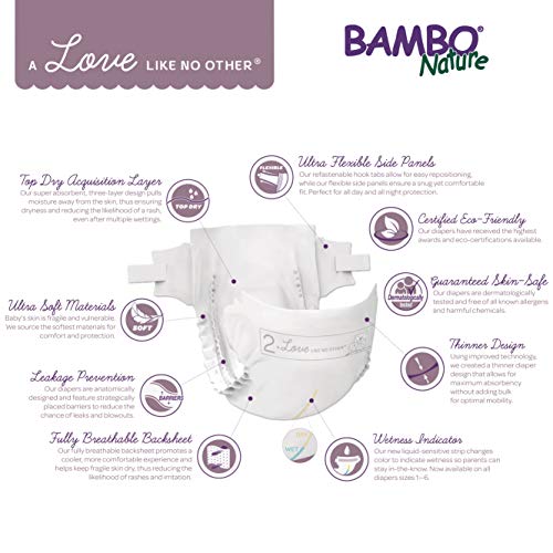 Bambo Nature disposable diapers are more than just eco-friendly-they’re safe and offer supernatural performance! Free Of harmful chemicals and all known allergens, our diapers have a unique three-layer design and super-absorbent core that can stand up to multiple wettings-even overnight. Combined with our fully breathable back sheet, baby’s sensitive skin will stay dry and comfortable. A wetness indicator changes color to indicate when a change is needed and our flexible, waistband and latex-free leg cuffs help diapers stay in place while maximizing movement so your child can boot, scoot and Boogie all day long. Ingredients: non-woven back sheet (outer side) of polypropylene (PP) and polyethylene (PE). absorbent of Polyacrylate (sap) and cellulose (ECF fluff). top sheet of non-woven (PP). acquisition layer of non-woven (pet/co-pet). hook tab fastening system of non-woven (PP/PE). adhesive made of synthetic rubber-no optical brightener added. Wetness indicator. Elastic at I on made from elastane.