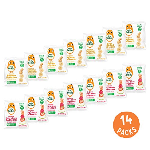 Little Bellies, Baby Bellies Organic Softcorn variety pack of two flavors; Apple & Berry Softcorn and Banana Softcorn baby snacks, for 10+ months, 0.28 Ounce Bags (Pack of 14)