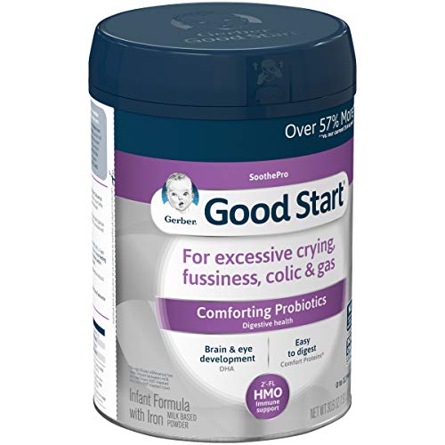 Gerber Good start soothe formula is designed for babies experiencing excessive crying and colic, fussiness, gas, and mild spit-up. Gerber Good start infant Formula is the only formula with HMO* (human milk oligosaccarides) and probiotics. Research has shown that hmos support digestive health and the developing immune system. Gerber Good start soothe formula has exclusive comforting probiotic L reuteri which has been clinically shown to reduce crying time in colicky babies. (Not from Human milk.) Ingredients: Corn Maltodextrin, Whey Protein Concentrate (From Milk, Enzymatically Hydrolyzed, Reduced In Minerals), Vegetable Oils (Palm Olein, Soy, Coconut, High Oleic Safflower Or High Oleic Sunflower), And Less Than 2% Of: Potassium Hydroxide, Calcium Chloride, Calcium Phosphate, Potassium Phosphate, Sodium Ascorbate, Sodium Citrate, Choline Bitartrate, 2′-O-Fucosyllactose*, M. Alpina Oil**, C. Cohnii Oil***, Citric Acid, Magnesium Chloride, Taurine, Nucleotides (Cytidine 5′-Monophosphate, Disodium Uridine 5′-Monophosphate, Adenosine 5′-Monophosphate, Disodium Guanosine 5′-Monophosphate), Inositol, Ferrous Sulfate, Alpha-Tocopheryl Acetate, Mixed Tocopherols, Ascorbyl Palmitate, Zinc Sulfate, Niacinamide, Calcium Pantothenate, L-Carnitine, Copper Sulfate, Vitamin A Acetate, Thiamine Mononitrate, Riboflavin, Pyridoxine Hydrochloride, Manganese Sulfate, Potassium Iodide, Folic Acid, Phylloquinone, Biotin, Sodium Selenate, Vitamin D3, Vitamin B12, Soy Lecithin, Lactobacillus Reuteri (Dsm 17938) Cultures.