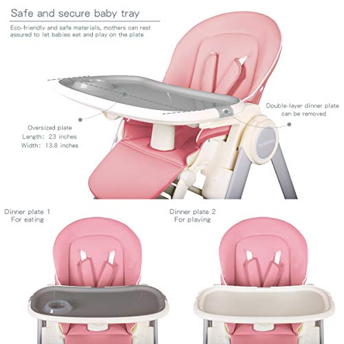 【Safety Guarded High Chair】:The Eco-friendly plastic tray with 3 gears adjustment button is hidden in the curved block, avoid the baby’s feet kicking the button and fall down from it 🙂