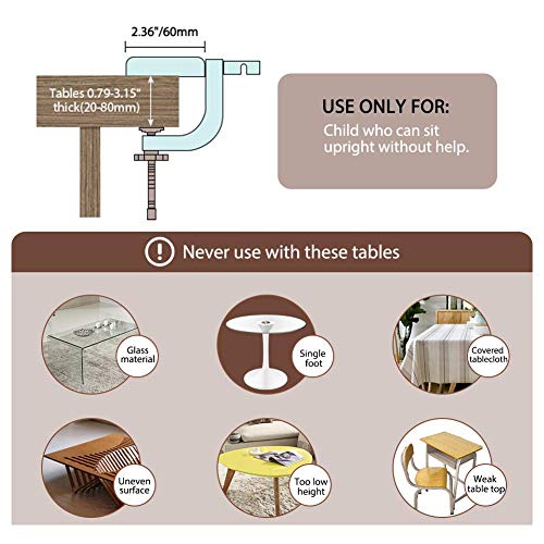 Safety Protection: The baby feeding seat join Non-slip soft plastic arms to protect tables from being scratched, precise and patented module parts to assure the chair can be easily tightened up and firmly fixed with a table.