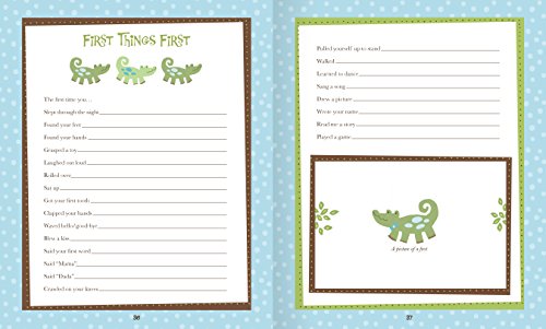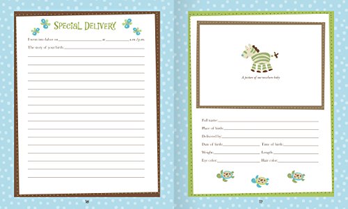 Decorative adorable animals art memory book to record memories and milestones of baby’s first 5 years. 62 fill in Archival quality pages that are acid-free and lignin-free that will preserve your precious memories. Pages Include: Mommy’s Family, Daddy’s Family, Family Ties, Pregnancy Chronicle, Baby Shower Guest/Gift List, My Special Delivery, The Perfect Name, Our Happy Family, Prints of Love (for Handprint and Footprint) Birth Certificate