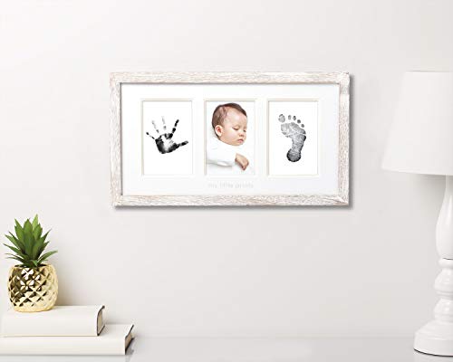 Pearhead Babyprints ‘My Little Prints’ Keepsake Frame helps you create a customized keepsake that you’ll adore year after year. With Pearhead Babyprints “My Little Print’ Keepsake Frame, you’ll capture an impression of your baby’s handprint and footprint to proudly display. This baby foot and handprint kit boasts a rustic distressed finish and silver lettering that blends seamlessly with any nursery décor, baby pictures, and other baby stuff. This is a lovely frame for baby. This creative keepsake is simple to use. You get a non-toxic, no-mess ink kit that comes with imprints cards, to make the best impression. The baby handprint inkpad is mess-free and never touches baby’s skin. Tips and tricks: for best impressions make sure baby is fed, changed, and calm. Flatten baby’s hand or foot and press onto the ink with imprint underneath. Instantly, you have a unique baby decoration of your baby’s tiny prints. Not sure what to get that mother-to-be for her upcoming baby shower? This baby picture frame with footprint and handprint makes a thoughtful baby shower gift, baptism gift, or christening gift. Can also be used as baby shower decor. Ideal for your own baby gift registry, too! This infant keepsake baby frame is perfect for a baby boy or baby girl. At Pearhead, we aim to create genuine, quality products to celebrate your special moments in life. We are a family of designers, marketers, and trendsetters bringing products to life that will bring a smile to your face. From concept and design to production and customer service, the Pearhead team works together seamlessly every step of the way. Whether your baby is celebrating their first year of life, you are announcing your pregnancy, or your pup is celebrating his first holiday season, Pearhead is here to share your moments in style. Frame dimensions: 17”W x 9.5”H x 0.56”D; Photo insert: 4”W x 6”H.