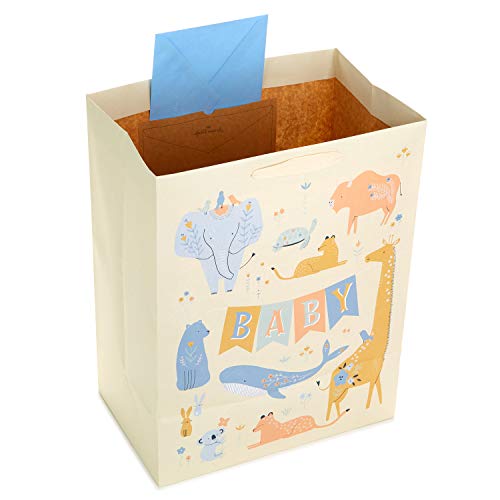 Celebrate a new bundle of joy with an adorable extra large baby gift bag with tissue paper. Great for baby showers, gender reveals, new parents and more, this roomy gift bag is perfect for giving a variety of baby gifts. Decorated in a soft yellow with foil accents, this baby bag features adorable animals including a whale, giraffe, bunny, elephant, koala, bear and turtle. The Hallmark brand is widely recognized as the very best for greeting cards, gift wrap, and more. For more than 100 years, Hallmark has been helping its customers make everyday moments more beautiful and celebrations more joyful.