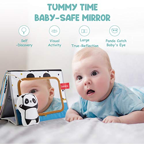 【Baby Book & Mirror 2 In 1】This tummy time toy combines cloth book and mirror to add more fun and interaction. Large true-reflection baby safe mirror engages baby’s developing vision and encourage baby self-discovery. The 4 Double-side cloth book page for visual stimulation and early learning.