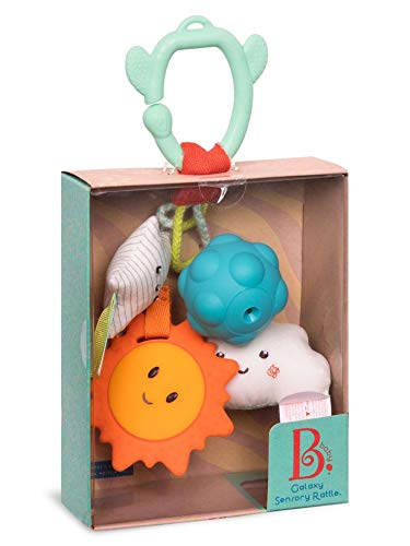 Watch your little one shake, squeeze, and play with the Dreamy Rattle from B. toys! Squish the blue, bumpy ball to hear it squeak or shake the soft cloud to hear the beads rattle. Then touch the star to make it crinkle or chew on the soothing sun teether! These easy-to-grab toys are perfect for itty-bitty hands, and they introduce your child to the concept of cause-and-effect. Not to mention that playing with this galaxy-themed rattle improves a baby’s sensory development! Parents will also be happy to know that our packaging is recyclable. Recommended for newborns and babies