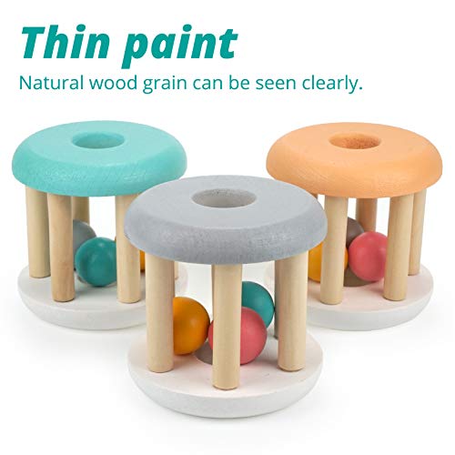 3 wooden balls tumble inside every roller when rolled or shaken entertains infants with a soothing wood on wood sound. No harsh irritating sounds.